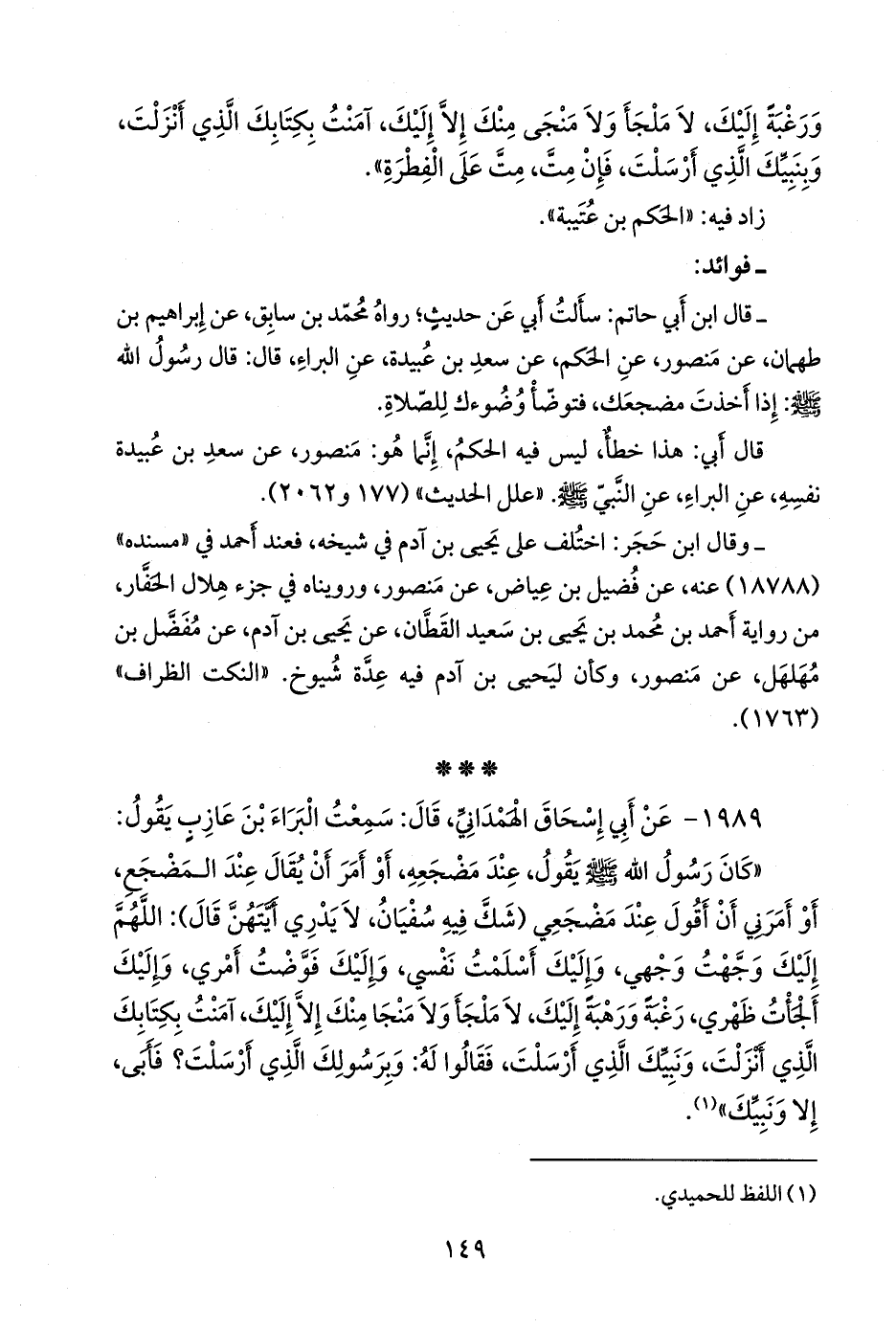 - قال عبد الرَّحمَن بن أبي حاتم الرازي: سألتُ أبي عن حديثٍ؛ رواه محمد بن سابق، عن إبراهيم بن طهمان، عن منصور، عن الحكم، عن سعد بن عُبَيدة، عن البراء، قال: قال رسول الله صَلى الله عَليه وسَلم: إذا أخذت مضجعك، فتوضأ وضوءك للصلاة.
