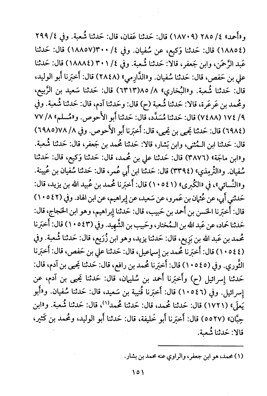 وفي ٩/ ١٤٢ (٧٤٨٨) قال: حدثنا مُسدد، قال: حدثنا أَبو الأحوص. و «مسلم» ٨/ ٧٧ (٦٩٨٤) قال: حدثنا يحيى بن يحيى، قال: أخبرنا أَبو الأحوص. وفي ٨/ ٧٨ (٦٩٨٥) قال: حدثنا ابن المثنى، وابن بشار، قالا: حدثنا محمد بن جعفر، قال: حدثنا شعبة. و «ابن ماجة» (٣٨٧٦) قال: حدثنا علي بن محمد، قال: حدثنا وكيع، قال: حدثنا سفيان. و «التِّرمِذي» (٣٣٩٤) قال: حدثنا ابن أبي عمر، قال: حدثنا سفيان بن عُيينة. و «النَّسَائي» في «الكبرى» (١٠٥٤١) قال: أخبرنا محمد بن عُبيد الله بن يزيد، قال: حدثني أبي، عن عثمان بن عَمرو، عن سعيد، عن إبراهيم، عن ابن الهاد. وفي (١٠٥٤٢) قال: أخبرنا الحسن بن أحمد بن حبيب، قال: حدثنا إبراهيم، وهو ابن الحجاج، قال: حدثنا حماد، عن عبد الله بن المختار، وحبيب بن الشهيد. وفي (١٠٥٤٣) قال: أخبرنا محمد بن عبد الله بن بزيع، قال: حدثنا يزيد، وهو ابن زُريع، قال: حدثنا شعبة. وفي (١٠٥٤٤) قال: أخبرنا محمد بن إسماعيل، قال: حدثنا علي بن حفص، قال: أخبرنا الثوري. وفي (١٠٥٤٥) قال: أخبرنا محمد بن رافع، قال: حدثنا يحيى بن آدم، قال: حدثنا إسرائيل (ح) وأخبرنا أحمد بن سليمان، قال: حدثنا يحيى بن آدم، عن إسرائيل. وفي (١٠٥٤٦) قال: أخبرنا قتيبة بن سعيد، قال: حدثنا سفيان. و «أَبو يَعلى» (١٧٢١) قال: حدثنا محمد، قال: حدثنا محمد (¬١)، قال: حدثنا شعبة. و «ابن حِبَّان» (٥٥٢٧) قال: أخبرنا أَبو خليفة، قال: حدثنا أَبو الوليد، ومحمد بن كثير، قالا: حدثنا شعبة.