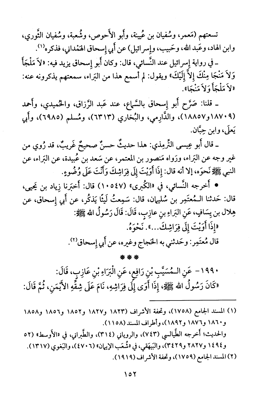- في رواية إسرائيل عند النَّسَائي، قال: وكان أَبو إسحاق يزيد فيه: «لا ملجأ ولا منجا منك إلا إليك» ويقول: لم أسمع هذا من البراء، سمعتهم يذكرونه عنه: «لا ملجأ ولا منجا».