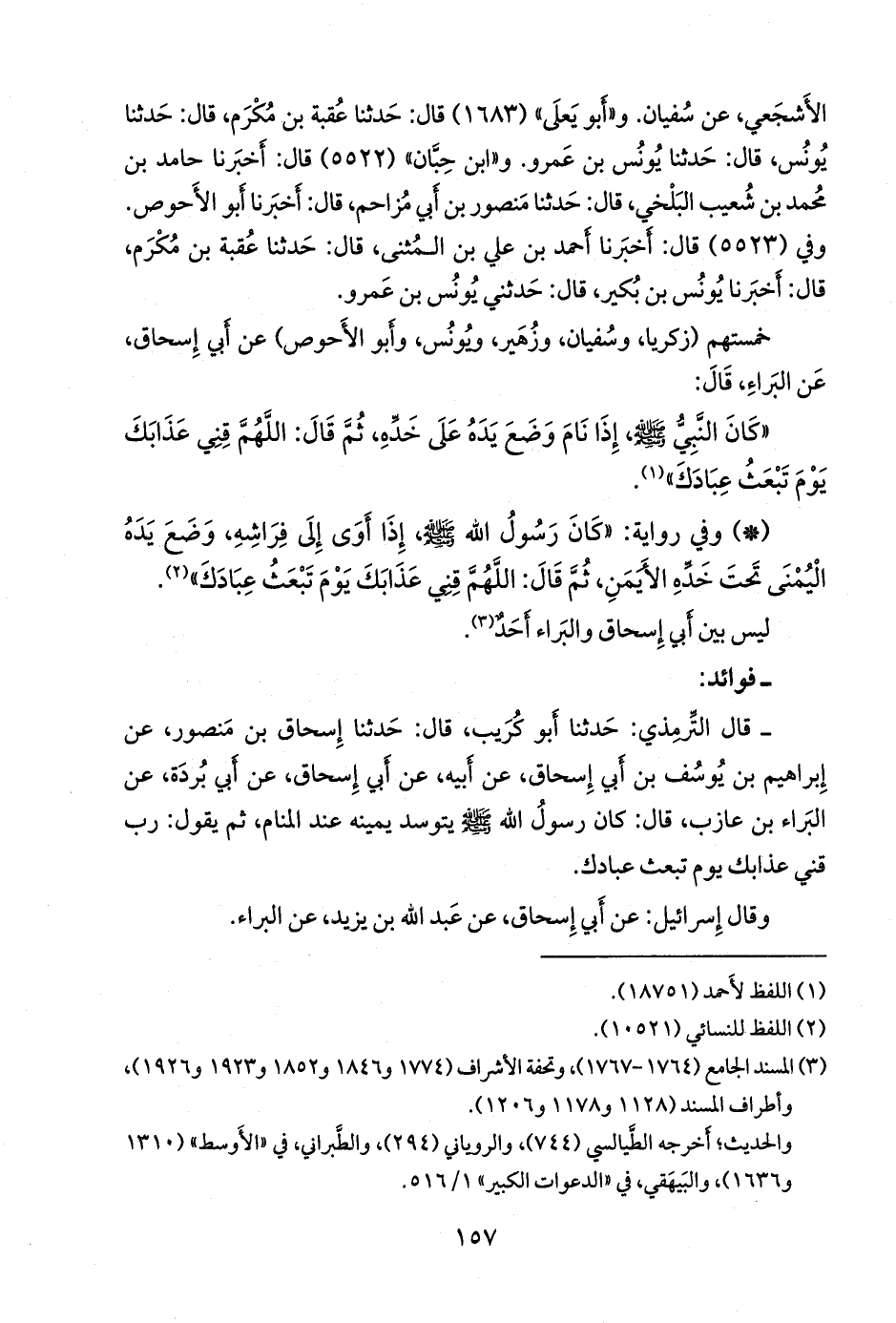 - قال التِّرمِذي: حدثنا أَبو كُريب، قال: حدثنا إسحاق بن منصور، عن إبراهيم بن يوسف بن أبي إسحاق، عن أبيه، عن أبي إسحاق، عن أبي بردة، عن البراء بن عازب، قال: كان رسول الله صَلى الله عَليه وسَلم يتوسد يمينه عند المنام، ثم يقول: رب قني عذابك يوم تبعث عبادك.