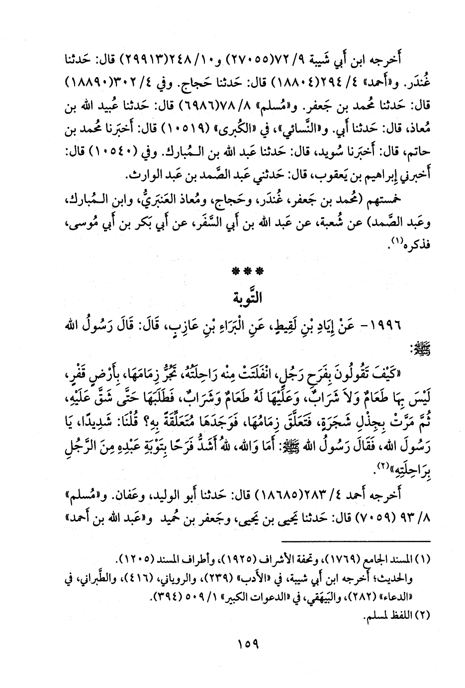 «كيف تقولون بفرح رجل، انفلتت منه راحلته، تجر زمامها، بأرض قفر، ليس بها طعام ولا شراب، وعليها له طعام وشراب، فطلبها حتى شق عليه، ثم مرت بجذل شجرة، فتعلق زمامها، فوجدها متعلقة به؟ قلنا: شديدا، يا رسول الله، فقال رسول الله صَلى الله عَليه وسَلم: أما والله، لله أشد فرحا بتوبة عبده من الرجل براحلته» (¬١).