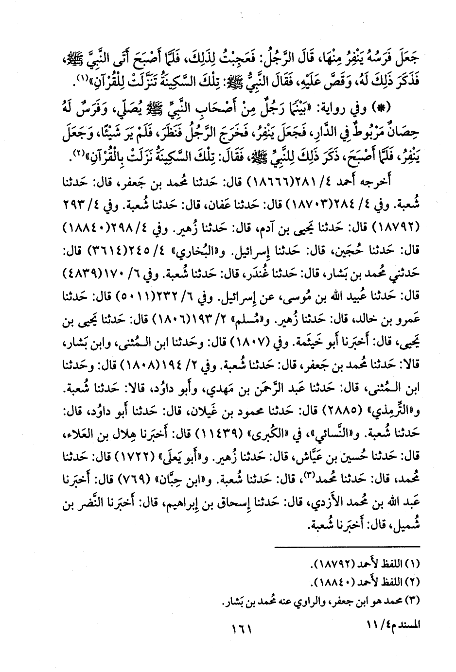 - وفي رواية: «بينما رجل من أصحاب النبي صَلى الله عَليه وسَلم يصلي، وفرس له حصان مربوط في الدار، فجعل ينفر، فخرج الرجل فنظر، فلم ير شيئا، وجعل ينفر، فلما أصبح، ذكر ذلك للنبي صَلى الله عَليه وسَلم فقال: تلك السكينة نزلت بالقرآن» (¬١).