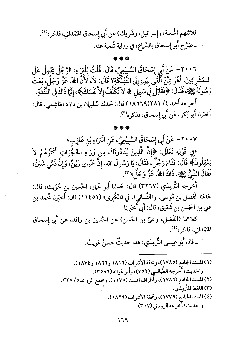 ٢٠٠٦ - عن أبي إسحاق السبيعي، قال: قلت للبراء: الرجل يحمل على المشركين، أهو ممن ألقى بيده إلى التهلكة؟ قال: لا، لأن الله، عز وجل، بعث رسوله صَلى الله عَليه وسَلم فقال: {فقاتل في سبيل الله لا تكلف إلا نفسك}، إنما ذاك في النفقة.