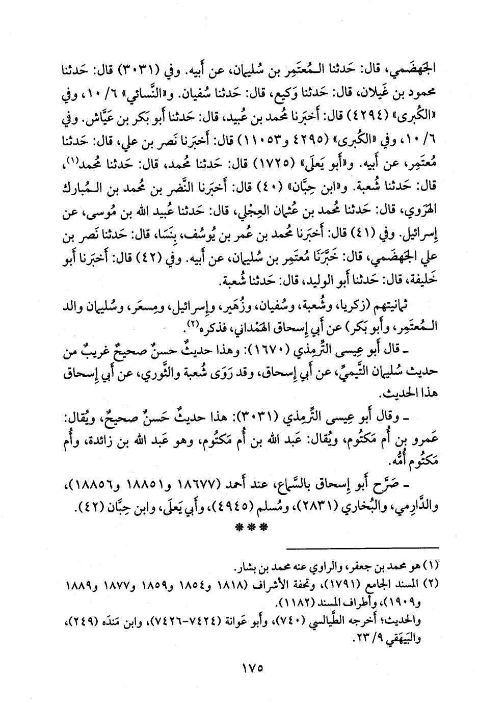 وفي (٣٠٣١) قال: حدثنا محمود بن غَيلان، قال: حدثنا وكيع، قال: حدثنا سفيان. و «النَّسَائي» ٦/ ١٠، وفي «الكبرى» (٤٢٩٤) قال: أخبرنا محمد بن عبيد، قال: حدثنا أَبو بكر بن عياش. وفي ٦/ ١٠، وفي «الكبرى» (٤٢٩٥ و ١١٠٥٣) قال: أخبرنا نصر بن علي، قال: حدثنا معتمر، عن أبيه. و «أَبو يَعلى» (١٧٢٥) قال: حدثنا محمد، قال: حدثنا محمد (¬١)، قال: حدثنا شعبة. و «ابن حِبَّان» (٤٠) قال: أخبرنا النضر بن محمد بن المبارك الهروي، قال: حدثنا محمد بن عثمان العجلي، قال: حدثنا عُبيد الله بن موسى، عن إسرائيل. وفي (٤١) قال: أخبرنا محمد بن عمر بن يوسف، بنسا، قال: حدثنا نصر بن علي الجهضمي، قال: خبرنا مُعتَمِر بن سليمان، عن أبيه. وفي (٤٢) قال: أخبرنا أَبو خليفة، قال: حدثنا أَبو الوليد، قال: حدثنا شعبة.