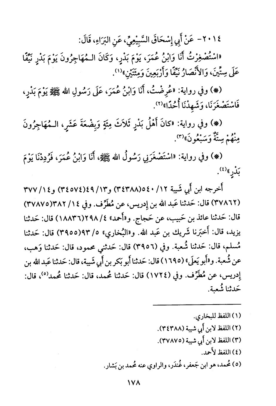 - وفي رواية: «عرضت، أنا وابن عمر، على رسول الله صَلى الله عَليه وسَلم يوم بدر، فاستصغرنا، وشهدنا أحدا» (¬٢).