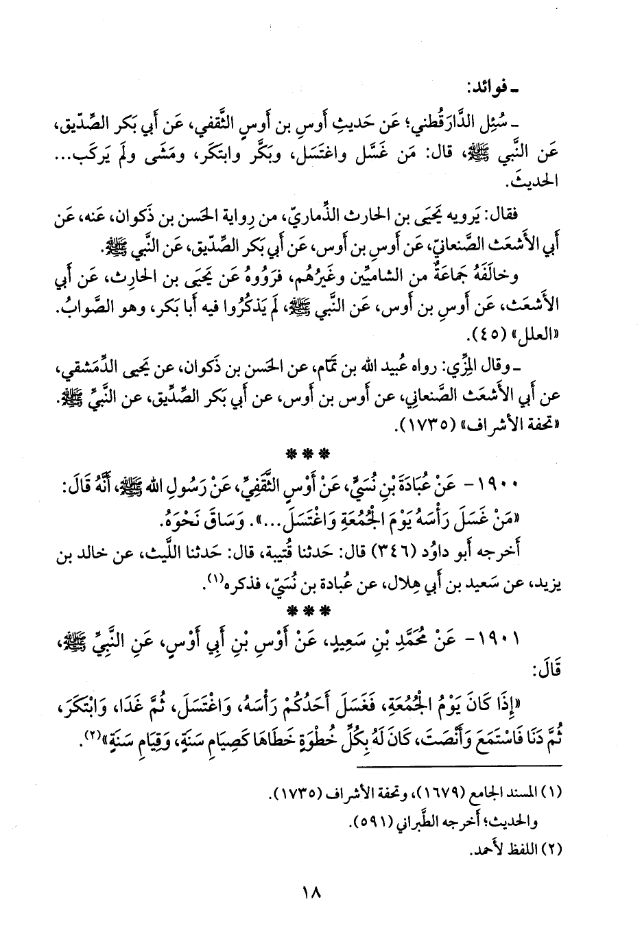 - سئل الدارقُطني؛ عن حديث أوس بن أوس الثقفي، عن أَبي بكر الصِّدِّيق، عن النبي صَلى الله عَليه وسَلم قال: من غسل واغتسل، وبكر وابتكر، ومشى ولم يركب، الحديث.