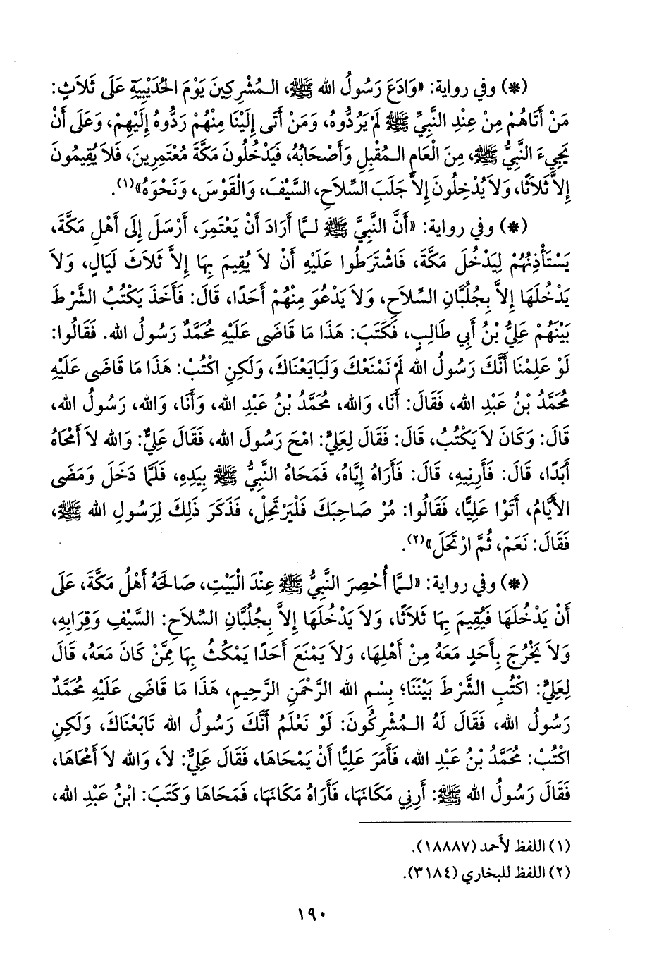 - وفي رواية: «لما أحصر النبي صَلى الله عَليه وسَلم عند البيت، صالحه أهل مكة، على أن يدخلها فيقيم بها ثلاثا، ولا يدخلها إلا بجلبان السلاح: السيف وقرابه، ولا يخرج بأحد معه من أهلها، ولا يمنع أحدا يمكث بها ممن كان معه، قال لعلي: اكتب الشرط بيننا؛ بسم الله الرَّحمَن الرحيم، هذا ما قاضى عليه محمد رسول الله، فقال له المشركون: لو نعلم أنك رسول الله تابعناك، ولكن اكتب: محمد بن عبد الله، فأمر عليا أن يمحاها، فقال علي: لا، والله لا أمحاها، فقال رسول الله صَلى الله عَليه وسَلم: أرني مكانها، فأراه مكانها، فمحاها وكتب: ابن عبد الله،