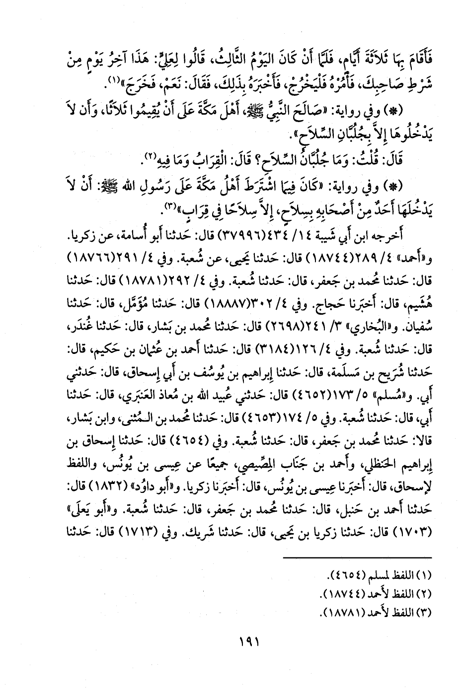 - وفي رواية: «كان فيما اشترط أهل مكة على رسول الله صَلى الله عَليه وسَلم: أن لا يدخلها أحد من أصحابه بسلاح، إلا سلاحا في قراب» (¬٢).