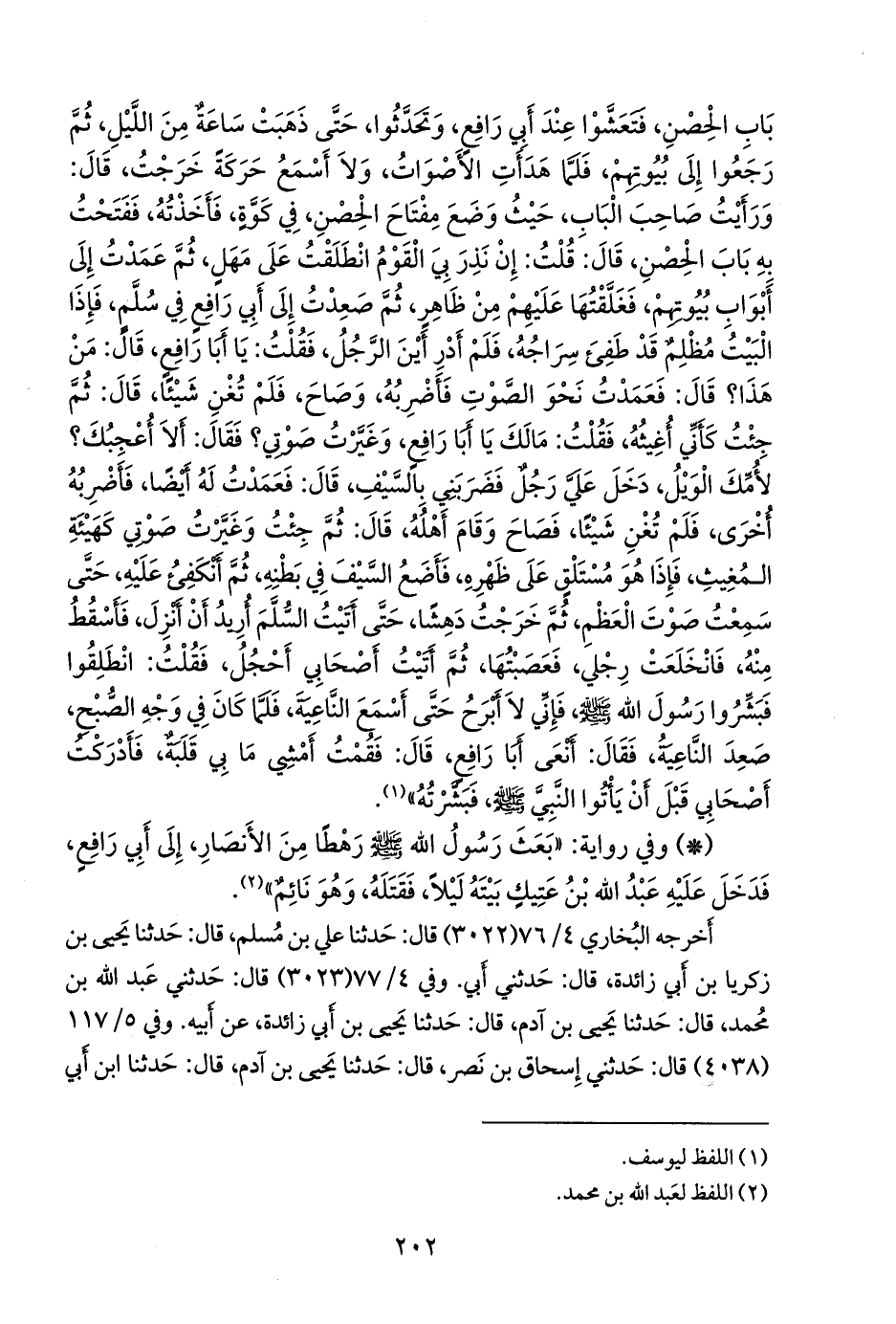 ثم صعدت إلى أبي رافع في سلم، فإذا البيت مظلم قد طفئ سراجه، فلم أدر أين الرجل، فقلت: يا أبا رافع، قال: من هذا؟ قال: فعمدت نحو الصوت فأضربه، وصاح، فلم تغن شيئا، قال: ثم جئت كأني أغيثه، فقلت: ما لك يا أبا رافع، وغيرت صوتي؟ فقال: ألا أعجبك؟ لأمك الويل، دخل علي رجل فضربني بالسيف، قال: فعمدت له أيضا، فأضربه أخرى، فلم تغن شيئا، فصاح وقام أهله، قال: ثم جئت وغيرت صوتي كهيئة المغيث، فإذا هو مستلق على ظهره، فأضع السيف في بطنه، ثم أنكفئ عليه، حتى سمعت صوت العظم، ثم خرجت دهشا، حتى أتيت السلم أريد أن أنزل، فأسقط منه، فانخلعت رجلي، فعصبتها، ثم أتيت أصحابي أحجل، فقلت: انطلقوا فبشروا رسول الله صَلى الله عَليه وسَلم فإني لا أبرح حتى أسمع الناعية، فلما كان في وجه الصبح، صعد الناعية، فقال: أنعى أبا رافع، قال: فقمت أمشي ما بي قلبة، فأدركت أصحابي قبل أن يأتوا النبي صَلى الله عَليه وسَلم فبشرته» (¬١).