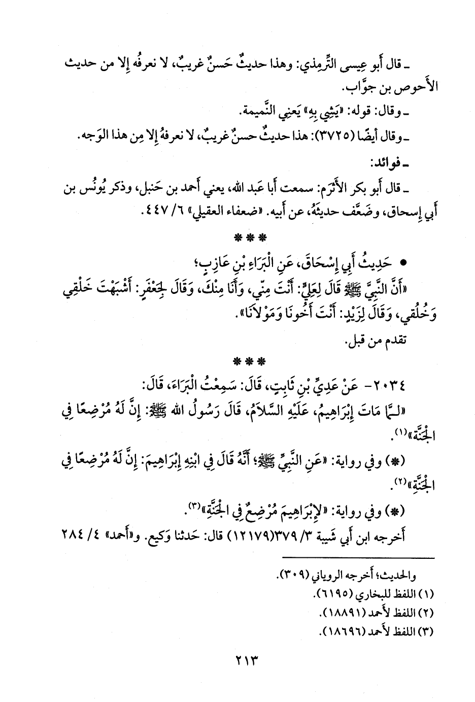 «أن النبي صَلى الله عَليه وسَلم قال لعلي: أنت مني، وأنا منك، وقال لجعفر: أشبهت خلقي وخلقي، وقال لزيد: أنت أخونا ومولانا».