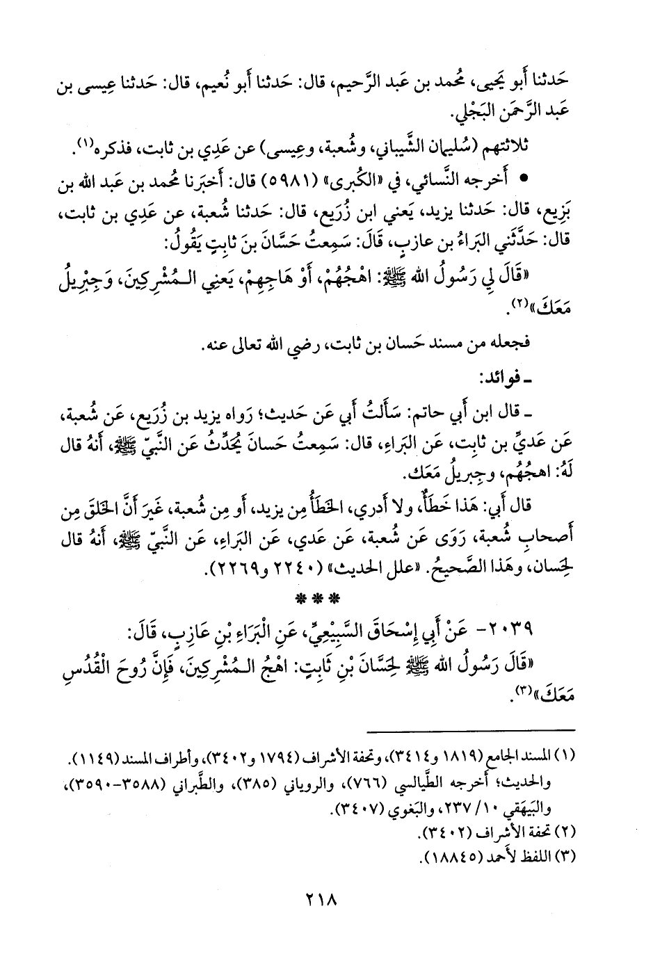 - قال عبد الرَّحمَن بن أبي حاتم الرازي: سألتُ أبي عن حديثٍ؛ رواه يزيد بن زُريع، عن شعبة، عن عَدي بن ثابت، عن البراء، قال: سمعت حسان يحدث عن النبي صَلى الله عَليه وسَلم أنه قال له: اهجهم، وجبريل معك.
