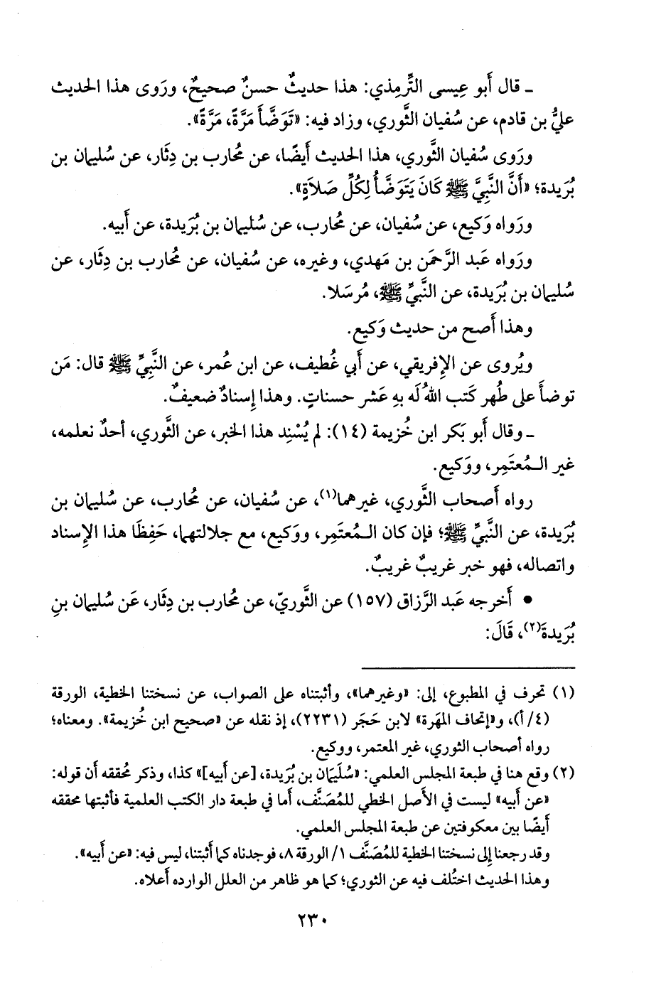 وروى سفيان الثوري، هذا الحديث أيضا، عن محارب بن دثار، عن سليمان بن بُريدة؛ «أن النبي صَلى الله عَليه وسَلم كان يتوضأ لكل صلاة».