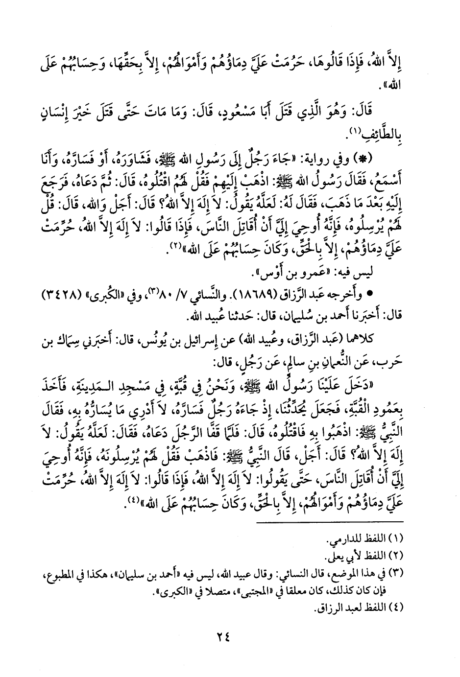 «دخل علينا رسول الله صَلى الله عَليه وسَلم ونحن في قبة، في مسجد المدينة، فأخذ بعمود القبة، فجعل يحدثنا، إذ جاءه رجل فساره، لا أدري ما يساره به، فقال النبي صَلى الله عَليه وسَلم: اذهبوا به فاقتلوه، قال: فلما قَفَّى الرجل دعاه، فقال: لعله يقول: لا إله إلا الله؟ قال: أجل، قال النبي صَلى الله عَليه وسَلم: فاذهب فقل لهم يرسلونه، فإنه أوحي إلي أن أقاتل الناس، حتى يقولوا: لا إله إلا الله، فإذا قالوا: لا إله إلا الله، حرمت علي دماؤهم وأموالهم، إلا بالحق، وكان حسابهم على الله» (¬١).
