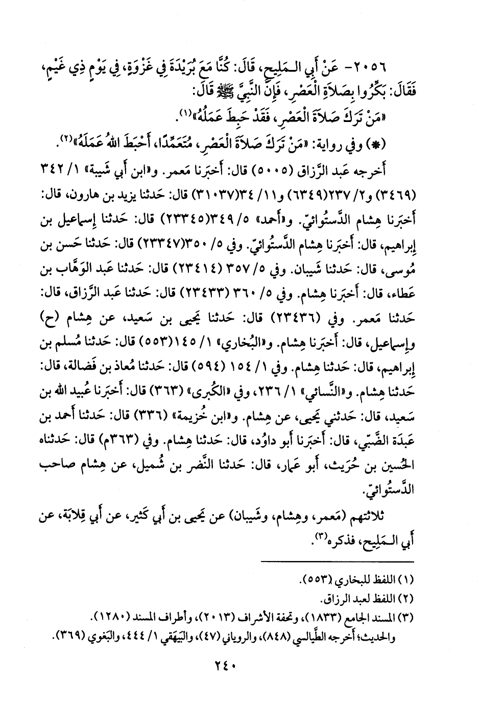 - وفي رواية: «من ترك صلاة العصر، متعمدا، أحبط الله عمله» (¬٢).