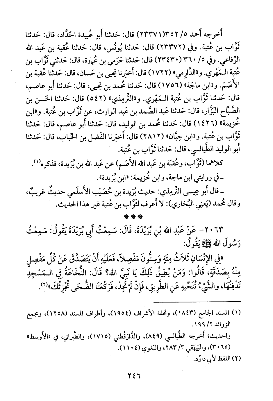 و «الدَّارِمي» (١٧٢٢) قال: أخبرنا يحيى بن حسان، قال: حدثنا عقبة بن الأصم. و «ابن ماجة» (١٧٥٦) قال: حدثنا محمد بن يحيى، قال: حدثنا أَبو عاصم، قال: حدثنا ثواب بن عُتبة المهري. و «التِّرمِذي» (٥٤٢) قال: حدثنا الحسن بن الصباح البزار، قال: حدثنا عبد الصمد بن عبد الوارث، عن ثواب بن عُتبة. و «ابن خزيمة» (١٤٢٦) قال: حدثنا محمد بن الوليد، قال: حدثنا أَبو عاصم، قال: حدثنا ثواب بن عُتبة. و «ابن حِبَّان» (٢٨١٢) قال: أخبرنا الفضل بن الحُبَاب، قال: حدثنا أَبو الوليد الطيالسي، قال: حدثنا ثواب بن عُتبة.