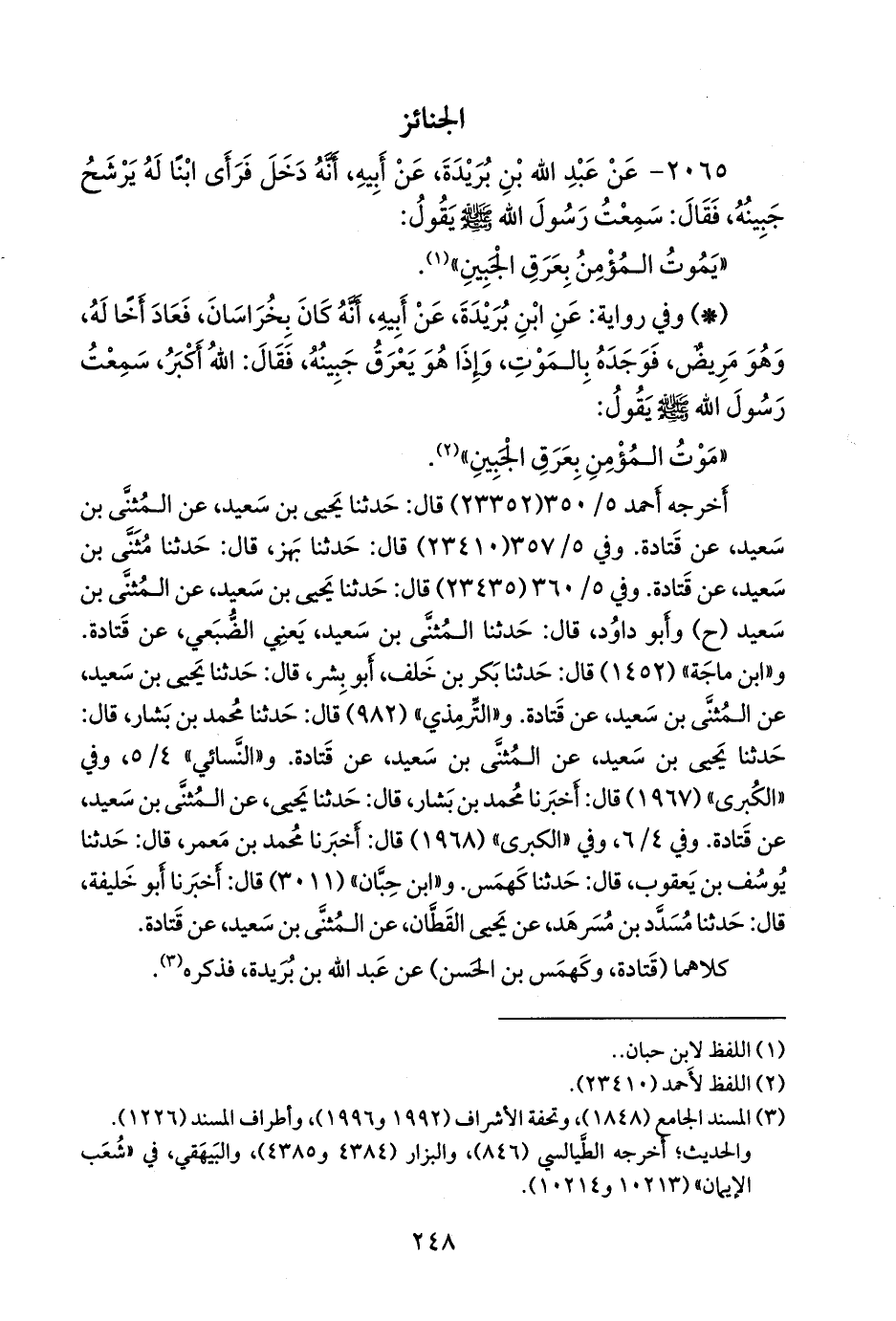 ٢٠٦٥ - عن عبد الله بن بُريدة، عن أبيه، أنه دخل فرأى ابنا له يرشح جبينه، فقال: سمعت رسول الله صَلى الله عَليه وسَلم يقول: