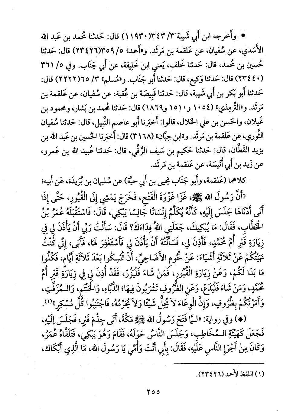 - وفي رواية: «لما فتح رسول الله صَلى الله عَليه وسَلم مكة، أتى جذم قبر، فجلس إليه، فجعل كهيئة المخاطب، وجلس الناس حوله، فقام وهو يبكي، فتلقاه عمر، وكان من أجرإ الناس عليه، فقال: بأبي أنت وأمي يا رسول الله، ما الذي أبكاك،