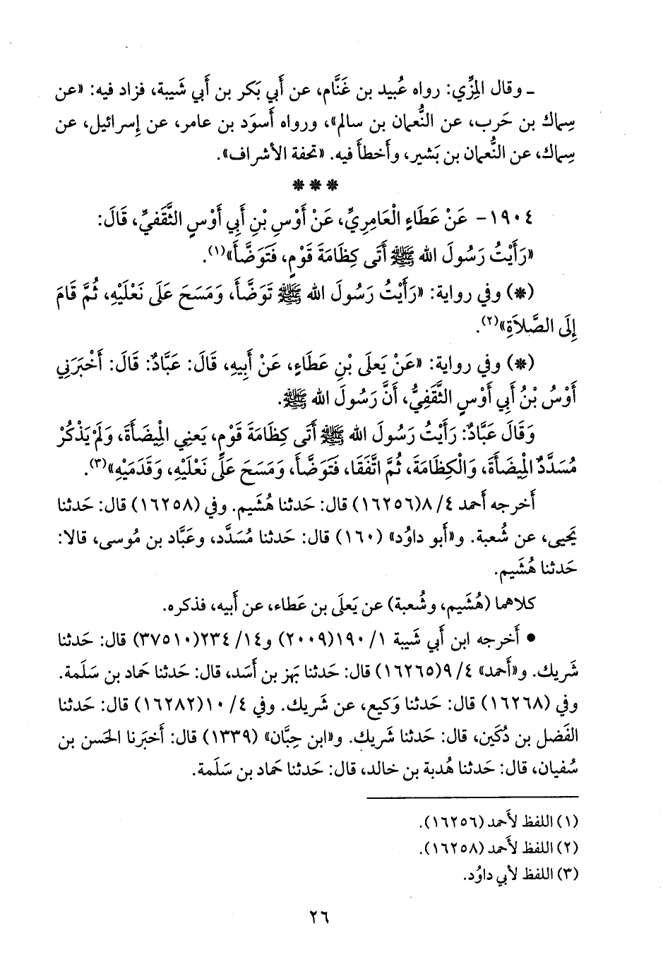 - وفي رواية: «رأيت رسول الله صَلى الله عَليه وسَلم توضأ، ومسح على نعليه، ثم قام إلى الصلاة» (¬٢).