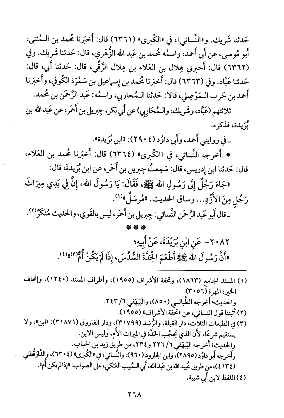 - وفي رواية: «عَنْ عَبْدِ اللهِ بْنِ بُرَيْدَةَ، عَنْ أَبِيهِ، قَالَ: أَطْعَمَ رَسُولُ اللهِ صَلى الله عَليه وسَلم الجَدَّةَ السُّدُسَ، إِذَا لَمْ تَكُنْ أُمٌّ» (¬٢).