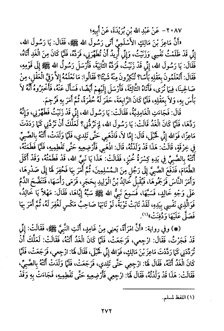 - وفي رواية: «أن امرأة، يعني من غامد، أتت النبي صَلى الله عَليه وسَلم فقالت: إني قد فجرت، فقال: ارجعي، فرجعت، فلما كان الغد أتته، فقالت: لعلك أن ترددني كما رددت ماعز بن مالك، فوالله إني لحبلى، فقال لها: ارجعي، فرجعت، فلما كان الغد أتته، فقال لها: ارجعي حتى تلدي، فرجعت، فلما ولدت أتته بالصبي، فقالت: هذا قد ولدته، فقال لها: ارجعي فأرضعيه حتى تفطميه، فجاءت به وقد