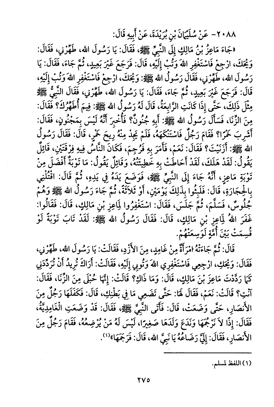«جاء ماعز بن مالك إلى النبي صَلى الله عَليه وسَلم فقال: يا رسول الله، طهرني، فقال: ويحك، ارجع فاستغفر الله وتب إليه، قال: فرجع غير بعيد، ثم جاء، فقال: يا رسول الله، طهرني، فقال رسول الله صَلى الله عَليه وسَلم: ويحك، ارجع فاستغفر الله وتب إليه، قال: فرجع غير بعيد، ثم جاء، فقال: يا رسول الله، طهرني، فقال النبي صَلى الله عَليه وسَلم مثل ذلك، حتى إذا كانت الرابعة، قال له رسول الله صَلى الله عَليه وسَلم: فيم أطهرك؟ فقال: من الزنا، فسأل رسول الله صَلى الله عَليه وسَلم: أبه جنون؟ فأخبر أنه ليس بمجنون، فقال: أشرب خمرا؟ فقام رجل فاستنكهه، فلم يجد منه ريح خمر، قال: فقال رسول الله صَلى الله عَليه وسَلم: أزنيت؟ فقال: نعم، فأمر به فرجم، فكان الناس فيه فرقتين، قائل يقول: لقد هلك، لقد أحاطت به خطيئته، وقائل يقول: ما توبة أفضل من توبة ماعز، أنه جاء إلى النبي صَلى الله عَليه وسَلم فوضع يده في يده، ثم قال: اقتلني بالحجارة، قال: فلبثوا بذلك يومين، أو ثلاثة، ثم جاء رسول الله صَلى الله عَليه وسَلم وهم جلوس، فسلم، ثم جلس، فقال: استغفروا لماعز بن مالك، قال: فقالوا: غفر الله لماعز بن مالك، قال: فقال رسول الله صَلى الله عَليه وسَلم: لقد تاب توبة لو قسمت بين أمة لوسعتهم.