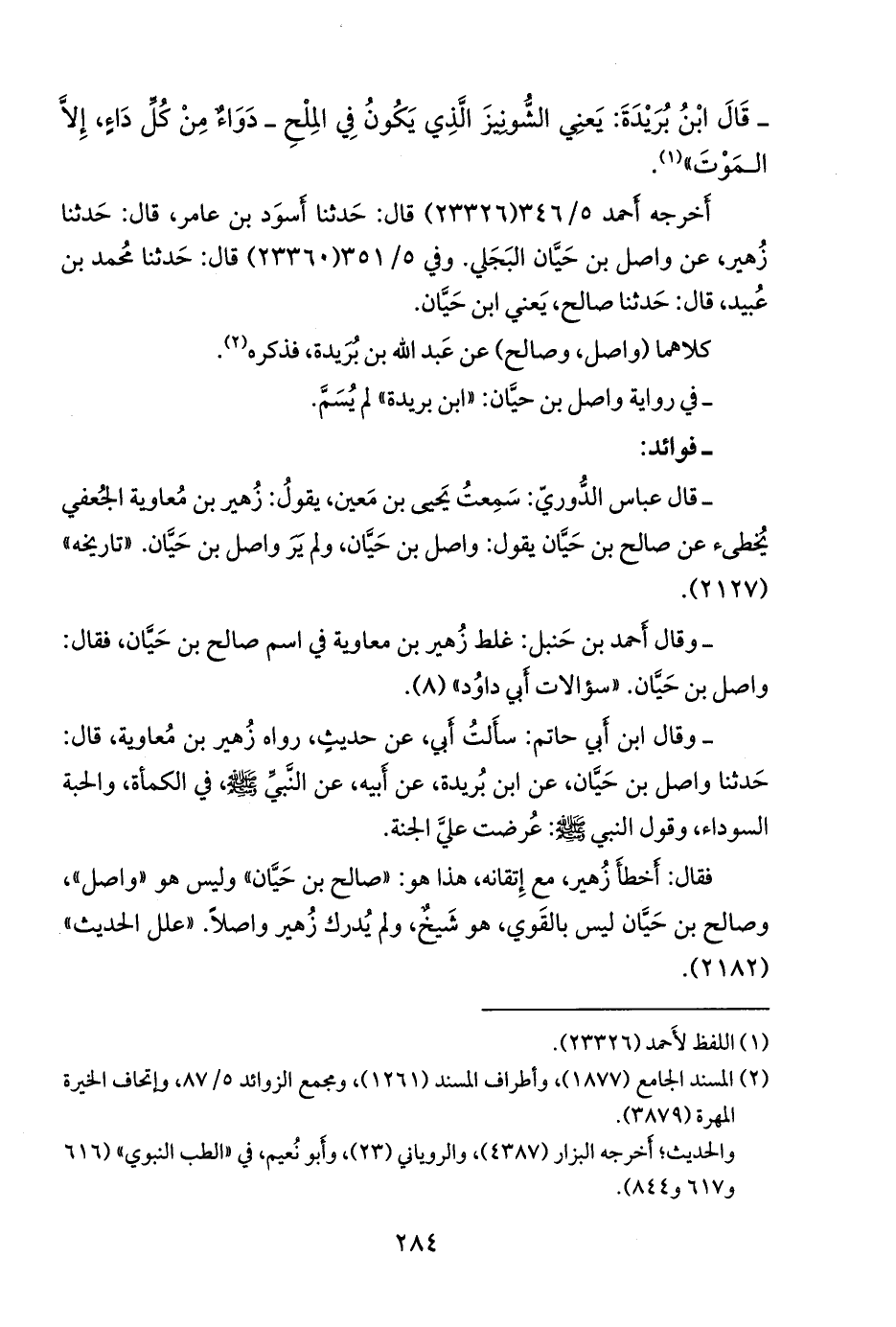 - وقال ابن أبي حاتم: سألت أبي، عن حديث، رواه زهير بن معاوية، قال: حدثنا واصل بن حيان، عن ابن بُريدة، عن أبيه، عن النبي صَلى الله عَليه وسَلم في الكمأة، والحبة السوداء، وقول النبي صَلى الله عَليه وسَلم: عرضت علي الجنة.