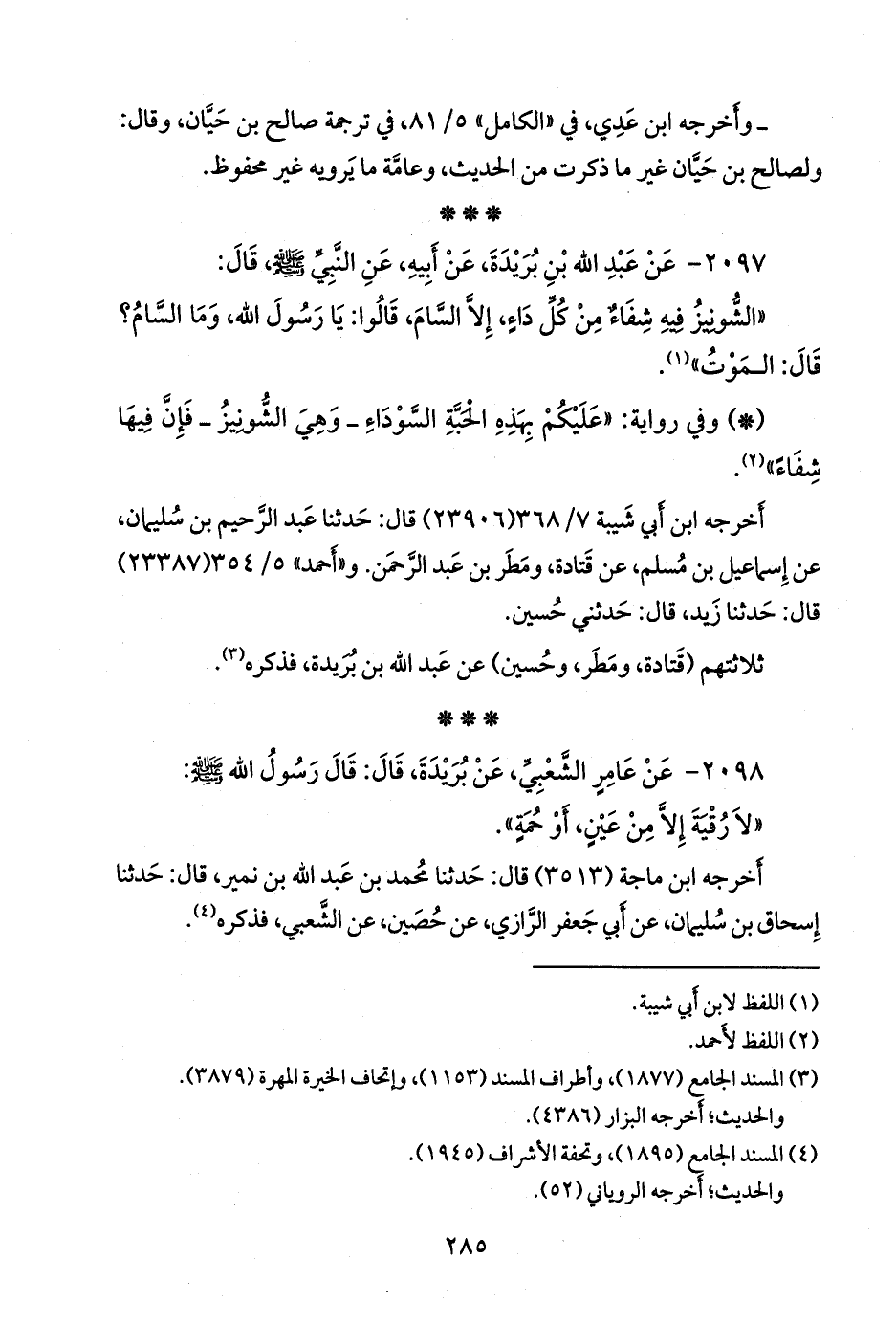 - وفي رواية: «عليكم بهذه الحبة السوداء، وهي الشونيز ـ فإن فيها شفاء» (¬٢).