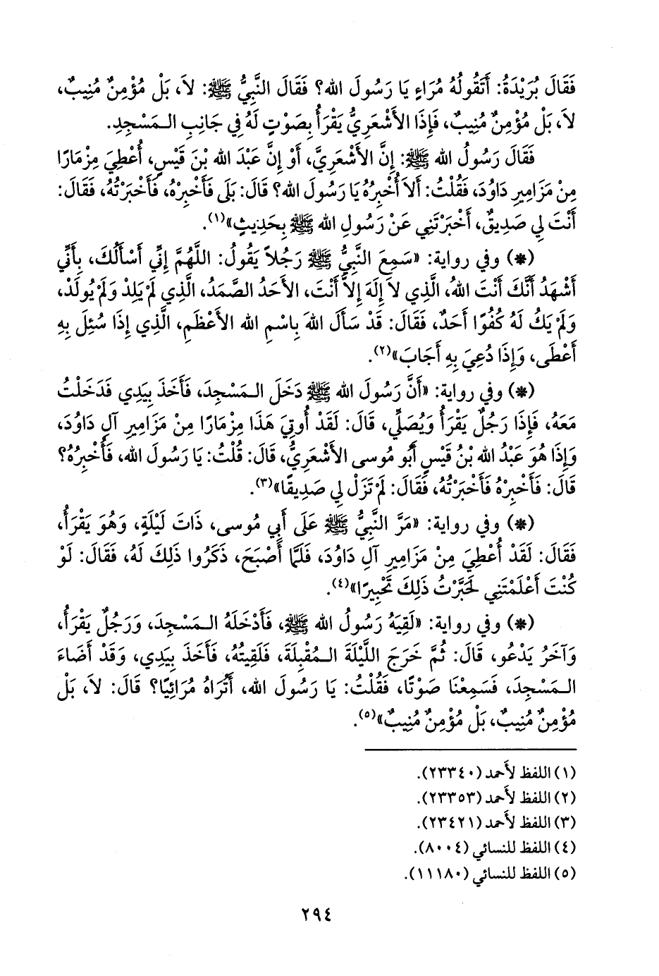 - وفي رواية: «أن رسول الله صَلى الله عَليه وسَلم دخل المسجد، فأخذ بيدي فدخلت معه، فإذا رجل يقرأ ويصلي، قال: لقد أوتي هذا مزمارا من مزامير آل داود، وإذا هو عبد الله بن قيس أَبو موسى الأشعري، قال: قلت: يا رسول الله، فأخبره؟ قال: فأخبره فأخبرته، فقال: لم تزل لي صديقا» (¬١).