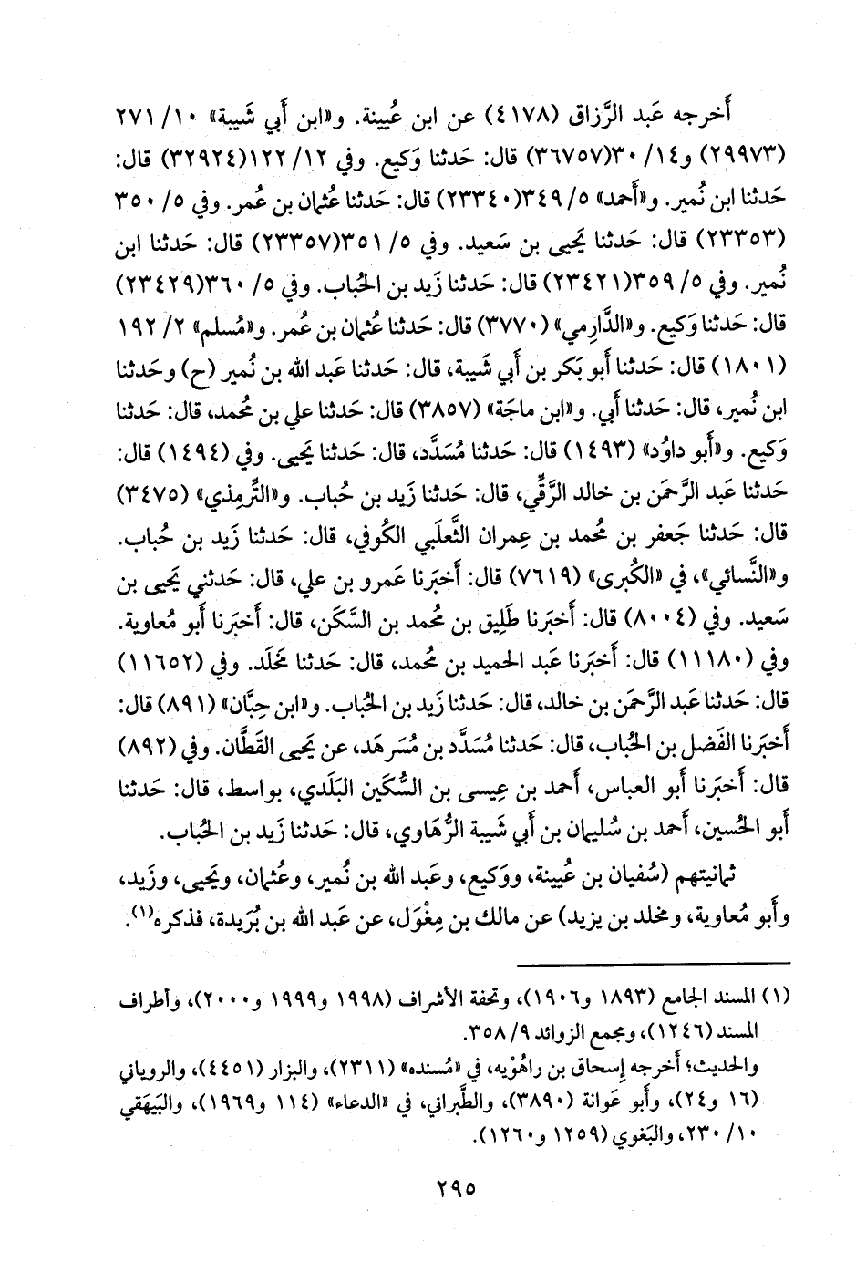 وفي ٥/ ٣٦٠ (٢٣٤٢٩) قال: حدثنا وكيع. و «الدَّارِمي» (٣٧٧٠) قال: حدثنا عثمان بن عمر. و «مسلم» ٢/ ١٩٢ (١٨٠١) قال: حدثنا أَبو بكر بن أبي شيبة، قال: حدثنا عبد الله بن نُمير (ح) وحدثنا ابن نُمير، قال: حدثنا أبي. و «ابن ماجة» (٣٨٥٧) قال: حدثنا علي بن محمد، قال: حدثنا وكيع. و «أَبو داود» (١٤٩٣) قال: حدثنا مُسدد، قال: حدثنا يحيى. وفي (١٤٩٤) قال: حدثنا عبد الرَّحمَن بن خالد الرَّقِّي، قال: حدثنا زيد بن حباب. و «التِّرمِذي» (٣٤٧٥) قال: حدثنا جعفر بن محمد بن عمران الثعلبي الكوفي، قال: حدثنا زيد بن حباب. و «النَّسَائي» في «الكبرى» (٧٦١٩) قال: أخبرنا عَمرو بن علي، قال: حدثني يحيى بن سعيد. وفي (٨٠٠٤) قال: أخبرنا طليق بن محمد بن السكن، قال: أخبرنا أَبو معاوية. وفي (١١١٨٠) قال: أخبرنا عبد الحميد بن محمد، قال: حدثنا مخلد. وفي (١١٦٥٢) قال: حدثنا عبد الرَّحمَن بن خالد، قال: حدثنا زيد بن الحُبَاب. و «ابن حِبَّان» (٨٩١) قال: أخبرنا الفضل بن الحُبَاب، قال: حدثنا مُسَدد بن مُسَرهد، عن يحيى القطان. وفي (٨٩٢) قال: أخبرنا أَبو العباس، أحمد بن عيسى بن السكين البلدي، بواسط، قال: حدثنا أَبو الحسين، أحمد بن سليمان بن أبي شيبة الرُّهاوي، قال: حدثنا زيد بن الحُبَاب.