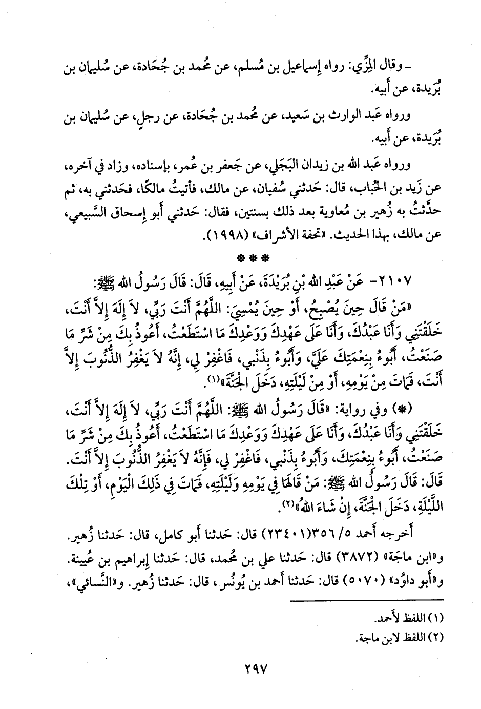 - وفي رواية: «قال رسول الله صَلى الله عَليه وسَلم: اللهم أنت ربي، لا إله إلا أنت، خلقتني وأنا عبدك، وأنا على عهدك ووعدك ما استطعت، أعوذ بك من شر ما صنعت، أَبوء بنعمتك، وأَبوء بذنبي، فاغفر لي، فإنه لا يغفر الذنوب إلا أنت. قال: قال رسول الله صَلى الله عَليه وسَلم: من قالها في يومه وليلته، فمات في ذلك اليوم، أو تلك الليلة، دخل الجنة، إن شاء الله» (¬٢).