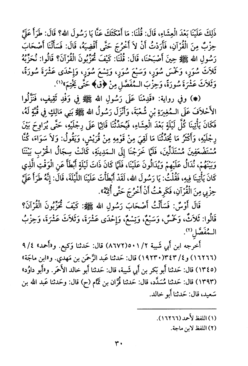 قال أوس: فسألت أصحاب رسول الله صَلى الله عَليه وسَلم: كيف تحزبون القرآن؟ قالوا: ثلاث، وخمس، وسبع، وتسع، وإحدى عشرة، وثلاث عشرة، وحزب المفصل (¬١).