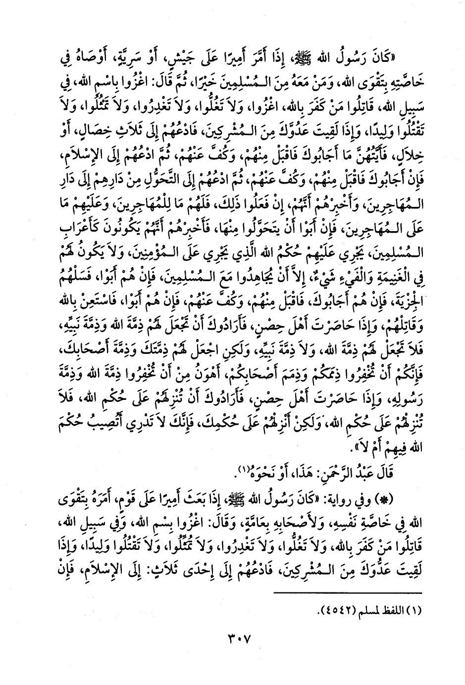 - وفي رواية: «كان رسول الله صَلى الله عَليه وسَلم إذا بعث أميرا على قوم، أمره بتقوى الله في خاصة نفسه، ولأصحابه بعامة، وقال: اغزوا بسم الله، وفي سبيل الله، قاتلوا من كفر بالله، ولا تغلوا، ولا تغدروا، ولا تمثلوا، ولا تقتلوا وليدا، وإذا لقيت عدوك من المشركين، فادعهم إلى إحدى ثلاث: إلى الإسلام، فإن
