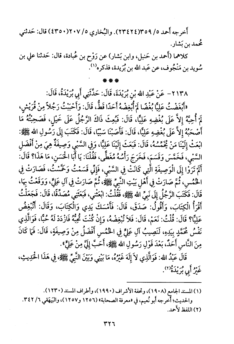 «أبغضت عليا بغضا لم أبغضه أحدا قط، قال: وأحببت رجلا من قريش، لم أحبه إلا على بغضه عليا، قال: فبعث ذاك الرجل على خيل، فصحبته ما أصحبه إلا على بغضه عليا، قال: فأصبنا سبيا، قال: فكتب إلى رسول الله صَلى الله عَليه وسَلم: ابعث إلينا من يخمسه، قال: فبعث إلينا عليا، وفي السبي وصيفة هي من أفضل السبي، فخمس وقسم، فخرج رأسه مغطى، فقلنا: يا أبا الحسن، ما هذا؟ قال: ألم تروا إلى الوصيفة التي كانت في السبي، فإني قسمت وخمست، فصارت في الخمس، ثم صارت في أهل بيت النبي صَلى الله عَليه وسَلم ثم صارت في آل علي، ووقعت بها، قال: فكتب الرجل إلى نبي الله صَلى الله عَليه وسَلم فقلت: ابعثني، فبعثني مصدقا، قال: فجعلت أقرأ الكتاب، وأقول: صدق، قال: فأمسك يدي والكتاب، وقال: أتبغض عليا؟ قال: قلت: نعم، قال: فلا تبغضه، وإن كنت تحبه فازدد له حبا، فوالذي نفس محمد بيده، لنصيب آل علي في الخمس أفضل من وصيفة، قال: فما كان من الناس أحد، بعد قول رسول الله صَلى الله عَليه وسَلم أحب إلي من علي».