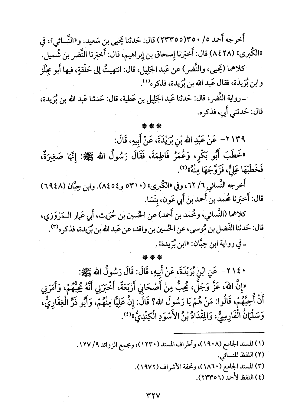 كلاهما (النَّسَائي، ومحمد بن أحمد) عن الحسين بن حريث أبي عمار المَرْوَزي، قال: حدثنا الفضل بن موسى، عن الحسين بن واقد، عن عبد الله بن بُريدة، فذكره (¬٢).