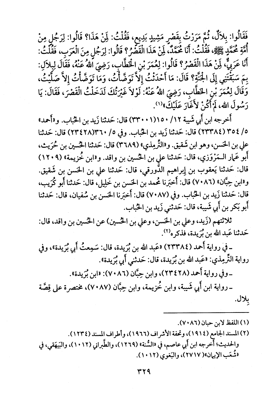 - رواية ابن أبي شيبة، وابن خزيمة، وابن حبان (٧٠٨٧)، مختصرة على قصة بلال.