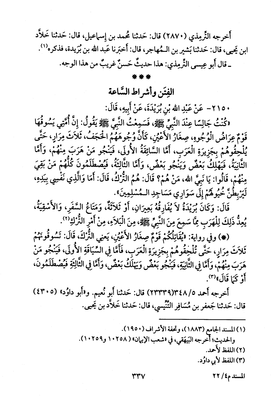 «كنت جالسا عند النبي صَلى الله عَليه وسَلم فسمعت النبي صَلى الله عَليه وسَلم يقول: إن أمتي يسوقها قوم عراض الوجوه، صغار الأعين، كأن وجوههم الحجف، ثلاث مرار، حتى يلحقوهم بجزيرة العرب، أما السائقة الأولى، فينجو من هرب منهم، وأما الثانية، فيهلك بعض وينجو بعض، وأما الثالثة، فيصطلمون كلهم من بقي منهم، قالوا: يا نبي الله، من هم؟ قال: هم الترك، قال: أما والذي نفسي بيده، ليربطن خيولهم إلى سواري مساجد المسلمين».