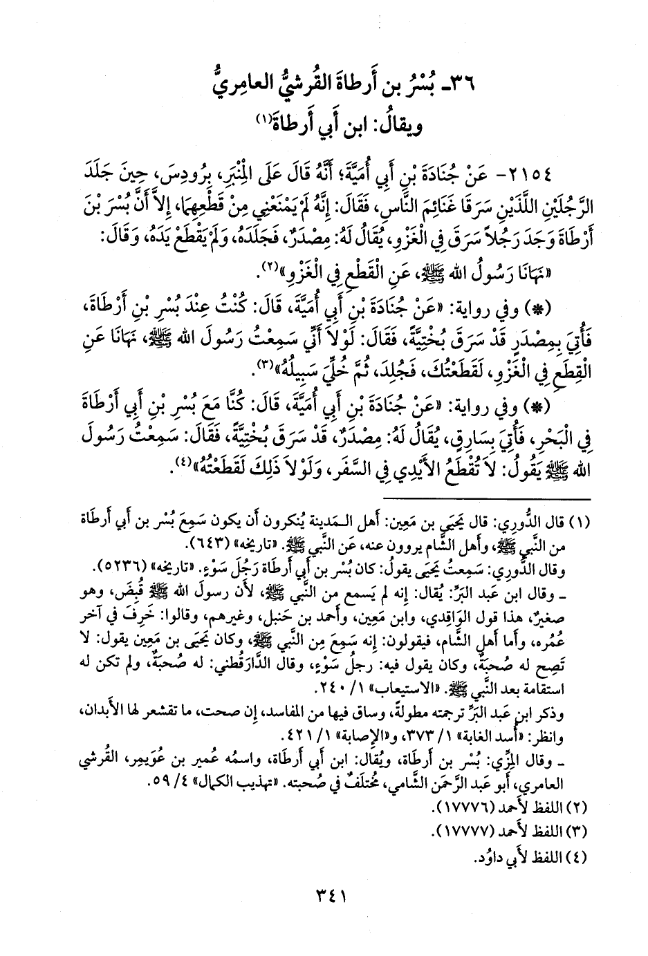 - وفي رواية: «عن جُنادة بن أبي أُمية، قال: كنا مع بسر بن أبي أَرطَاة في البحر، فأتي بسارق، يقال له: مصدر، قد سرق بختية، فقال: سمعت رسول الله صَلى الله عَليه وسَلم يقول: لا تقطع الأيدي في السفر، ولولا ذلك لقطعته» (¬٤).