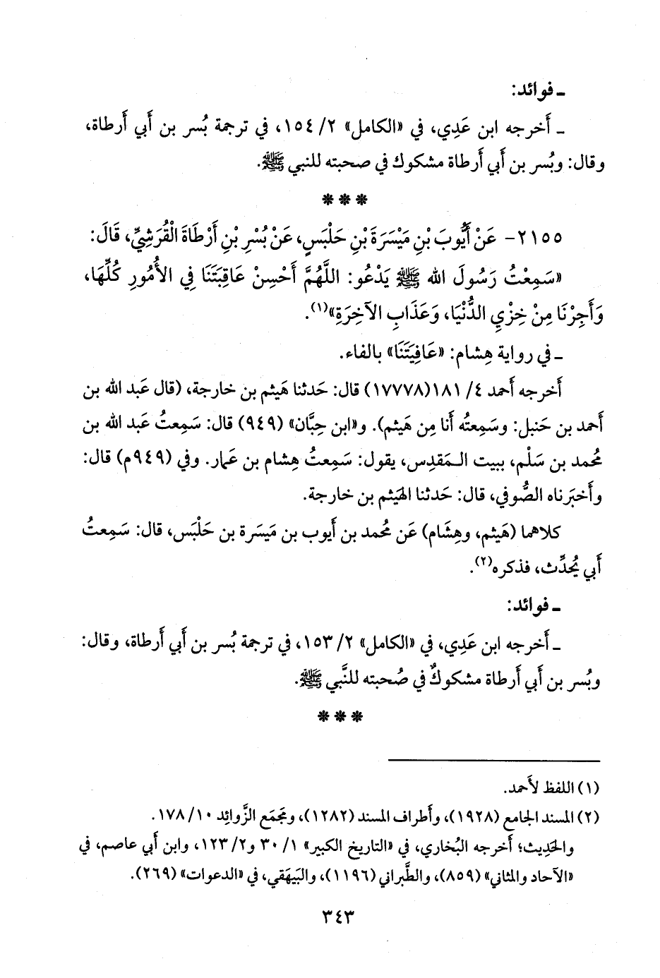 - أخرجه ابن عَدي في «الكامل» ٢/ ١٥٣، في مناكير بسر بن أبي أَرطَاة، وقال: وبسر بن أبي أَرطَاة مشكوك في صحبته للنبي صَلى الله عَليه وسَلم.
