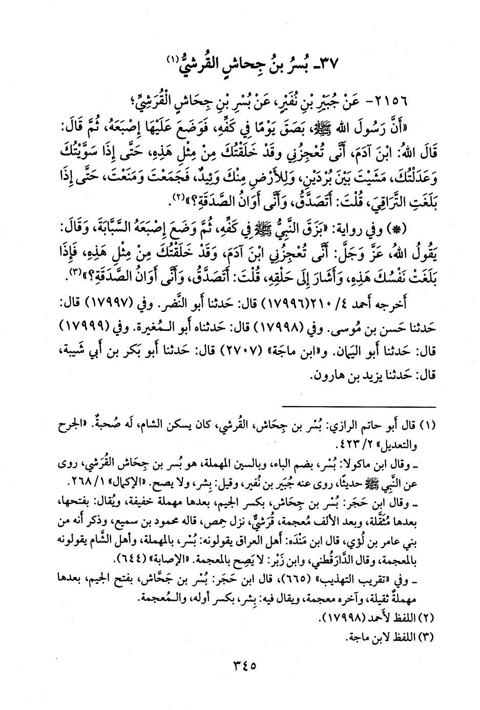 «أن رسول الله صَلى الله عَليه وسَلم بصق يوما في كفه، فوضع عليها إصبعه، ثم قال: قال الله: ابن آدم، أنى تعجزني وقد خلقتك من مثل هذه، حتى إذا سويتك وعدلتك، مشيت بين بردين، وللأرض منك وئيد، فجمعت ومنعت، حتى إذا بلغت التراقي، قلت: أتصدق، وأنى أوان الصدقة؟» (¬٢).