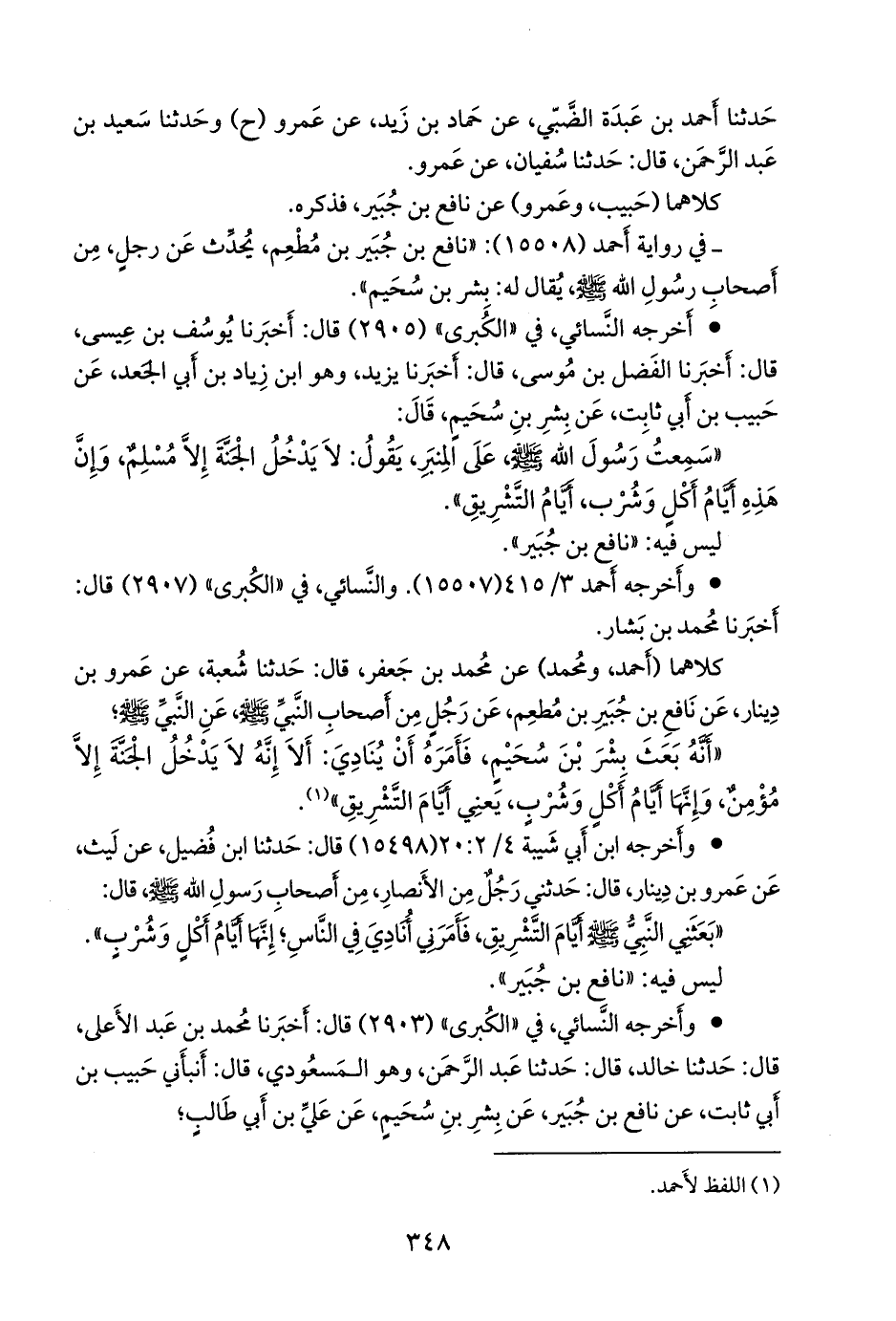«أن منادي رسول الله صَلى الله عَليه وسَلم خرج في أيام التشريق، فقال: إنه لا يدخل الجنة إلا نفس مسلمة، ألا وإن هذه الأيام أيام أكل وشرب».