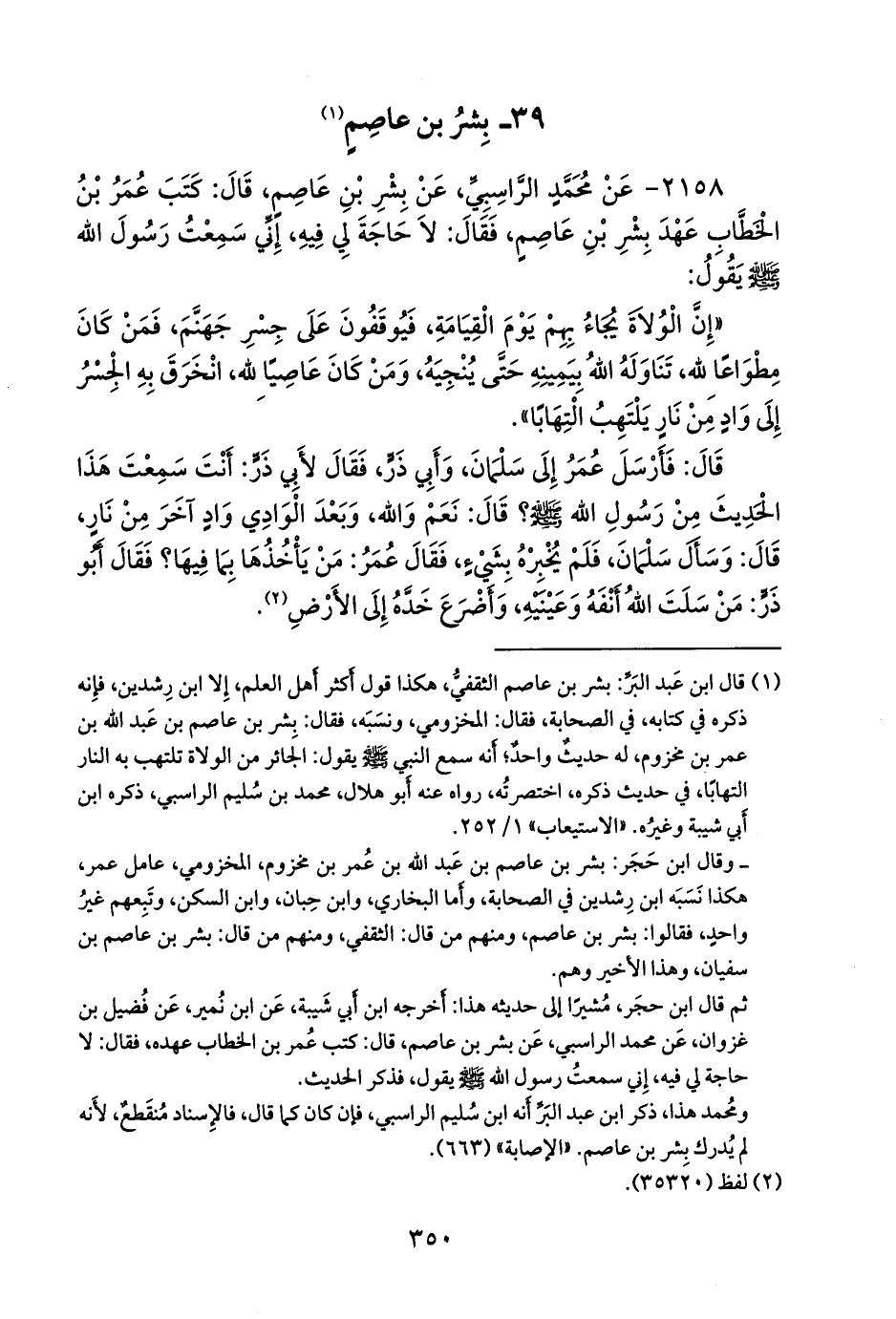 ثم قال ابن حجر، مشيرا إلى حديثه هذا: أخرجه ابن أبي شيبة، عن ابن نُمير، عن فضيل بن غزوان، عن محمد الراسبي، عن بشر بن عاصم، قال: كتب عمر بن الخطاب عهده، فقال: لا حاجة لي فيه، إني سمعت رسول الله صَلى الله عَليه وسَلم يقول، فذكر الحديث.