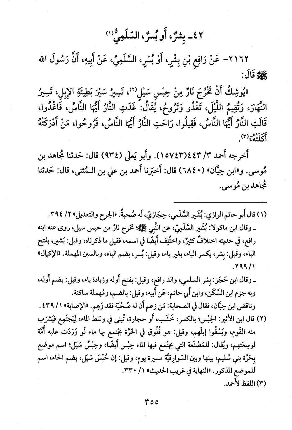 - وقال ابن ماكولا: بشير السلمي، عن النبي صَلى الله عَليه وسَلم؛ تخرج نار من حبس سيل، روى عنه ابنه رافع، في حديثه اختلاف كثير، واختلف أيضا في اسمه، فقيل ما ذكرناه، وقيل: بشير، بفتح الباء، وقيل: بشر، بكسر الباء، بغير ياء، وقيل: بسر، بضم الباء، وبالسين المهملة. «الإكمال» ١/ ٢٩٩.