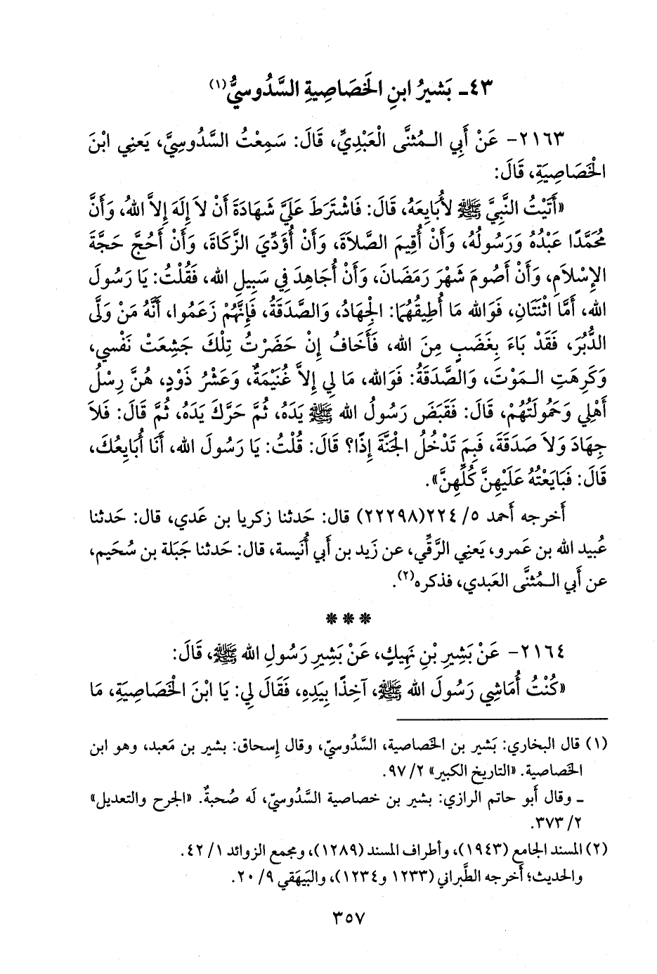 (¬١) قال البخاري: بشير بن الخصاصية، السدوسي، وقال إسحاق: بشير بن مَعبد، وهو ابن الخصاصية. «التاريخ الكبير» ٢/ ٩٧.
