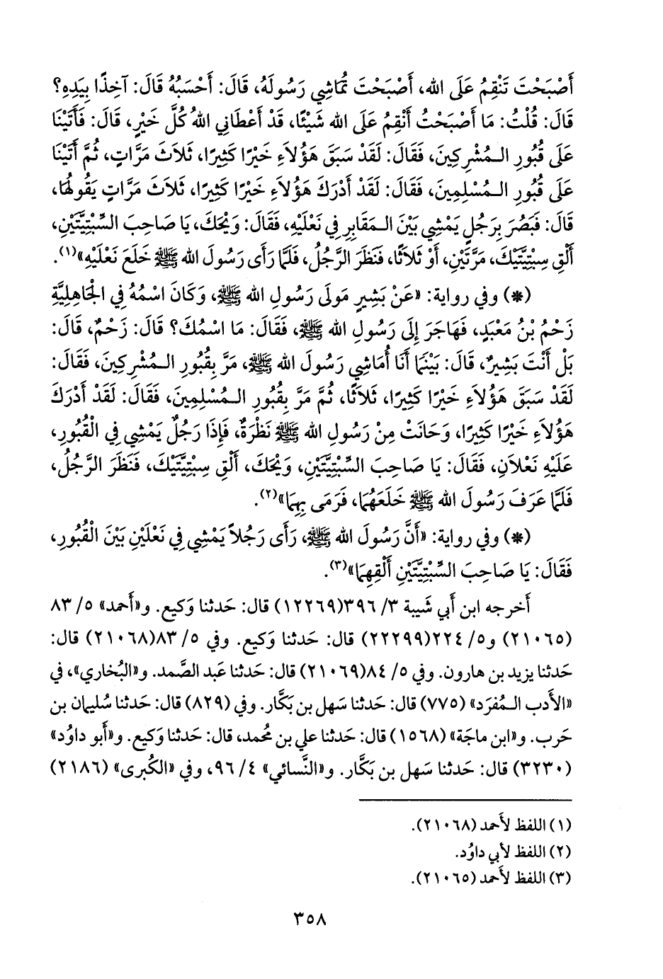 - وفي رواية: «أن رسول الله صَلى الله عَليه وسَلم رأى رجلا يمشي في نعلين بين القبور، فقال: يا صاحب السبتيتين ألقهما» (¬١).