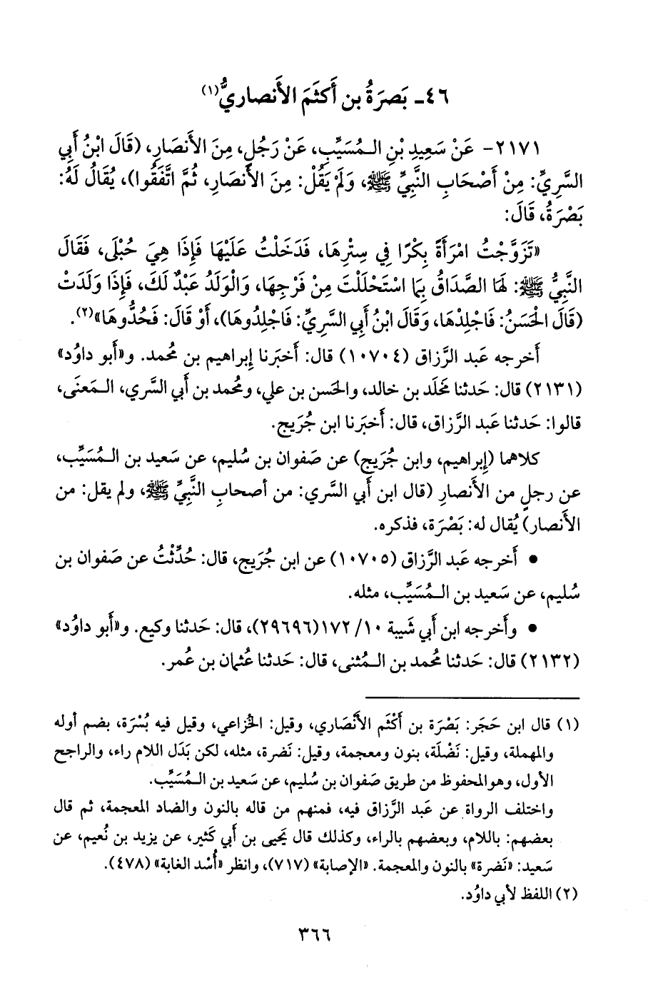 (¬١) قال ابن حجر: بصرة بن أكثم الأَنصاري، وقيل: الخُزاعي، وقيل فيه بسرة، بضم أوله والمهملة، وقيل: نضلة، بنون ومعجمة، وقيل: نضرة، مثله، لكن بدل اللام راء، والراجح الأول، وهوالمحفوظ من طريق صفوان بن سليم، عن سعيد بن المُسَيب.