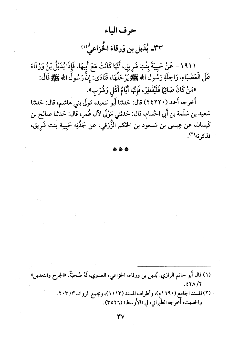١٩١١ - عن حبيبة بنت شريق، أنها كانت مع أبيها، فإذا بديل بن ورقاء على العضباء، راحلة رسول الله صَلى الله عَليه وسَلم يرحلها، فنادى: إن رسول الله صَلى الله عَليه وسَلم قال: