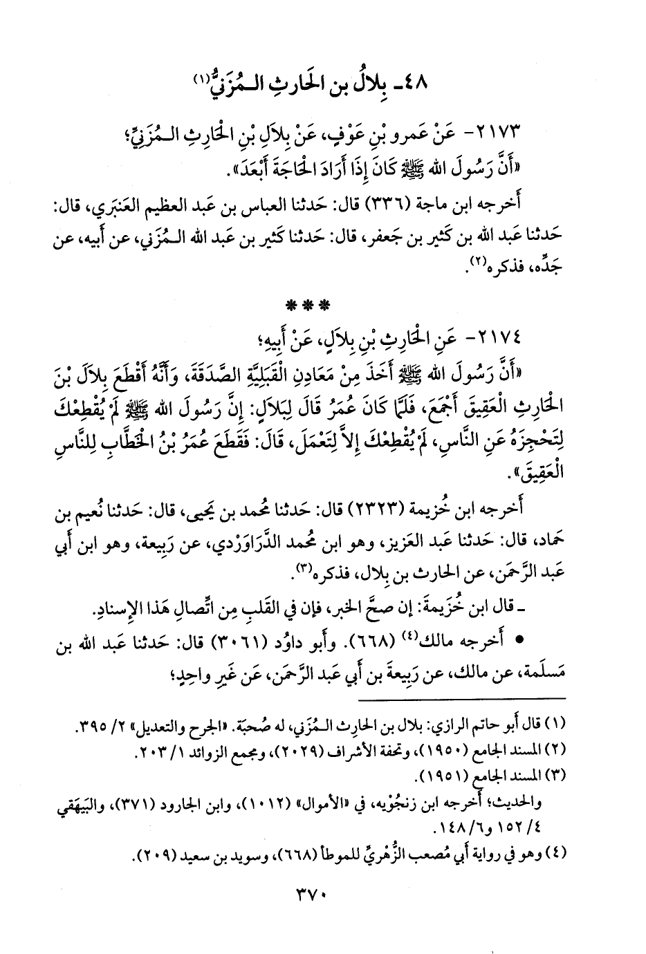 (¬١) قال أَبو حاتم الرازي: بلال بن الحارث المزني، له صحبة. «الجرح والتعديل» ٢/ ٣٩٥.