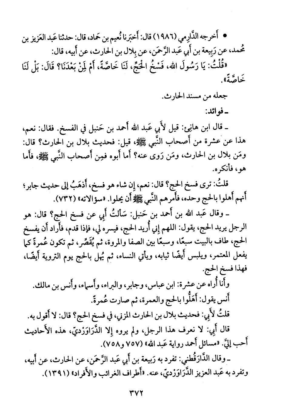 - وقال عبد الله بن أحمد بن حنبل: سألت أبي عن فسخ الحج؟ قال: هو الرجل يريد الحج، يقول: اللهم إني أريد الحج، فيسره لي، فإذا قدم، فأراد أن يفسخ الحج، طاف بالبيت سبعا، وسبعا بين الصفا والمروة، ثم يقصر، ثم تكون عمرة كما يفعل المُعتَمِر، ويلبس أيضا ثيابه، ويأتي النساء، ثم يهل بالحج يوم التروية أيضا، فهذا فسخ الحج.