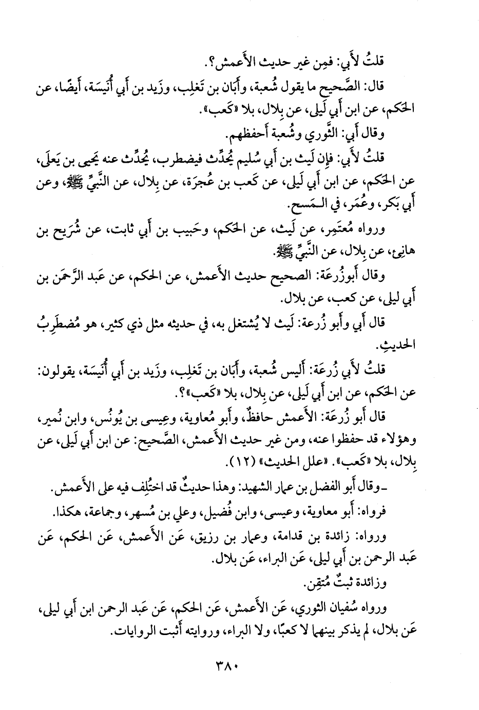 ورواه سفيان الثوري، عن الأعمش، عن الحكم، عن عبد الرَّحمَن بن أبي ليلى، عن بلال، لم يذكر بينهما لا كعبا، ولا البراء، وروايته أثبت الروايات.