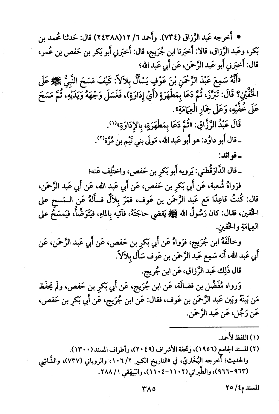 ورواه عبد الملك بن أبجر، عن أَبي بكر بن حفص، عن أبي عبد الرَّحمَن مسلم بن يسار أنه كان قاعدا عند عبد الرَّحمَن بن عوف، فقال عبد الرَّحمَن: يا بلال كيف مسح رسول الله صَلى الله عَليه وسَلم؟.
